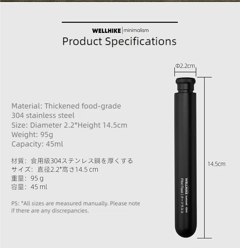 2.With its compact size of 2.2 diameter x 14.5cm height and lightweight design at just 95g, the Wellhike Portable Small Wine Jug 45ml is effortlessly portable, ideal for outdoor adventures, travel, or daily use.